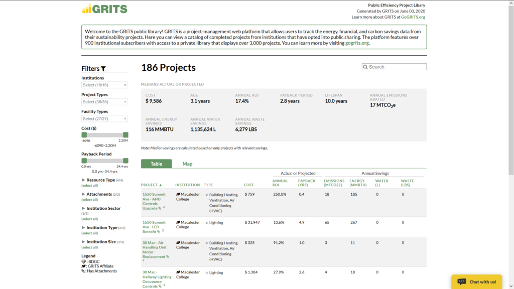Community Connections We are all deeply affected by the COVID-19 pandemic. So much is in flux and our daily lives have been upended by stay-at-home advisories and travel restrictions. Practically all the schools using GRITS are closed and on-campus living experienced an early close this year. We hope you and your loved ones are able to stay safe. Many of our users are key staff on university campuses, usually managing energy efficiency and other sustainability efforts. We have heard that some have been called into duty on the front lines of health & safety operations, participating in facility closures, emergency planning, and pandemic response measures. We wish these folks the best of luck and fortitude. By working together, we will make it through the significant challenges we now face. Let us know if there’s anything we can help you with. GRITS Goals Coming Soon: The BIGGEST Enhancement to GRITS ever! After years of optimization and incremental improvements, we have begun work on a dramatic expansion of the scope of the GRITS platform. A new suite of features called “GRITS Goals” will empower users to develop detailed climate and sustainability action plans by assembling their projects into resource-reduction scenarios. You’ll be able to build out a pathway to your institution’s targets for emissions, energy, water, waste, and even cost reduction. Below is a sneak peek at a draft build of the GRITS Goals chart. GRITS in Facilities Manager Magazine We are proud to share a recent article about GRITS in Facilities Manager, the journal of APPA – Leadership in Educational Facilities. The article provides a succinct description of how GRITS supports facilities professionals and how it illustrates the impact of their work. Read descriptions of the case study webinars we have held over the past several months from Colgate University, Macalester College, City of Philadelphia, and the State of Vermont. How can a stimulus bill create free money? In 2009, $650k of ARRA money provided the University of New Hampshire an important seed investment for setting up their green revolving fund. The initial investment was used to upgrade their facilities, which lowered utility bills. Those savings were reinvested into more energy efficiency projects. Ten years later, over 50 projects have been financed through their GRF and resulted in more than $4 million in savings. This is what we hope to see in the coming years using pandemic response stimulus funding. Let us know if you anticipate setting up a revolving fund in the near future. Our parent organization, the Sustainable Endowments Institute, has a lot of resources on how to make it happen! Let us know how we can partner with you to support your important work. You can reach out via our contact form.