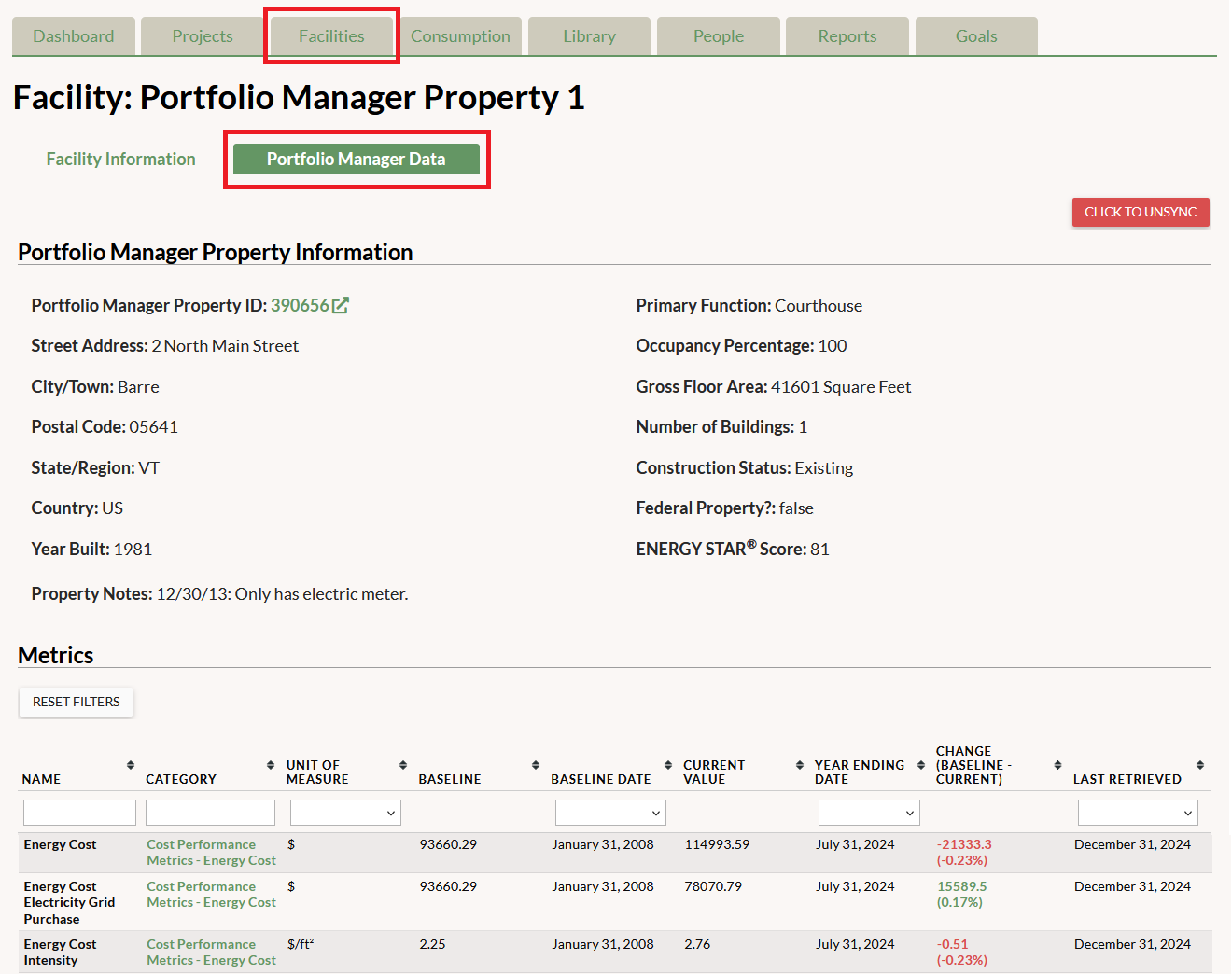When you import facility data from Portfolio Manager together with the meters linked to those facilities, you’ll be able to review your meter data and related metrics in your GRITS account. You can find this data by navigating to the Facilities tab, clicking the “View” link next to any of your facilities, and then clicking on the “Portfolio Manager Data” sub-tab. (If you haven’t linked your Portfolio Manager and GRITS accounts yet, this article illustrates the steps involved.)